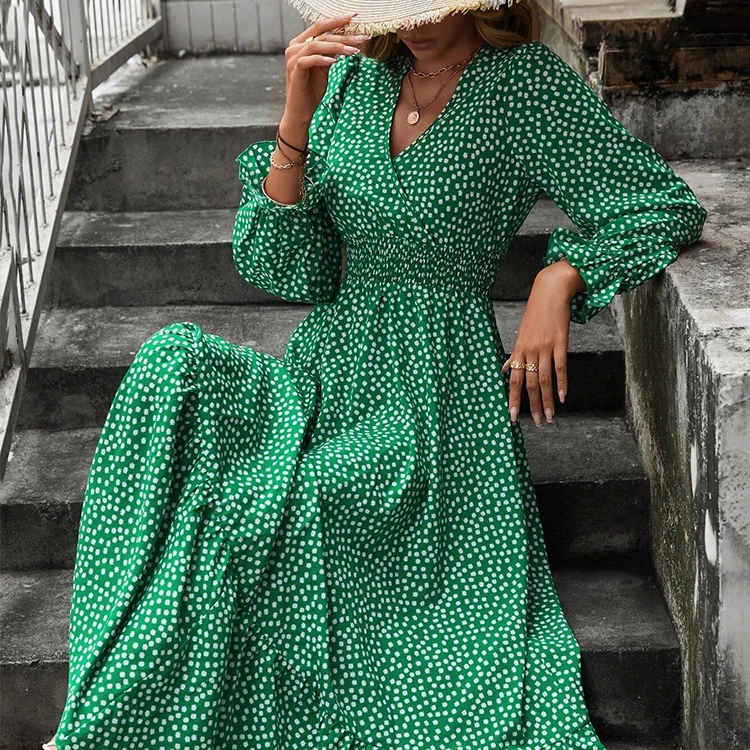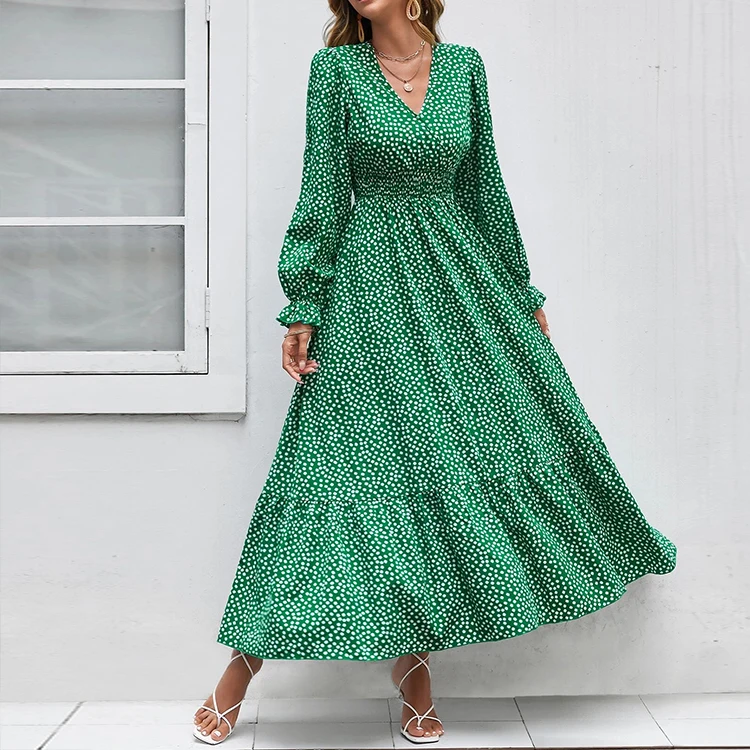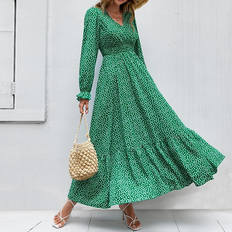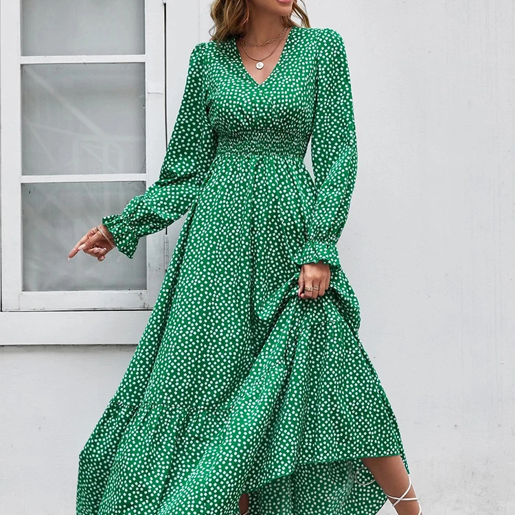 HL Manufacturer Spring Long Flounce Sleeve Dress Women Wholesale Custom Casual Floral Shirred Ruffle Dress Polka Dot Dress